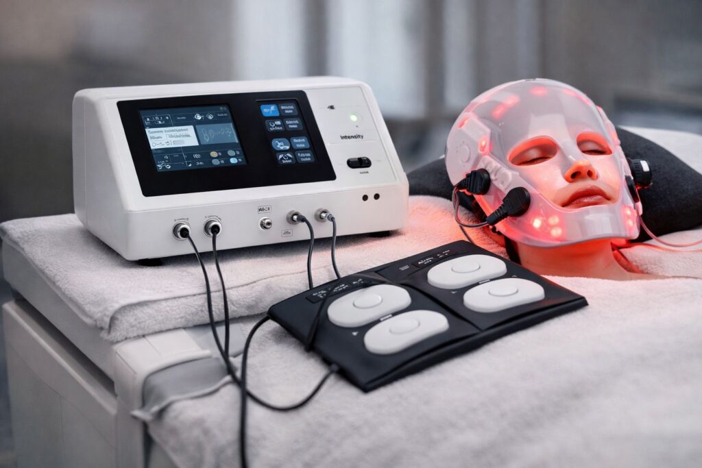 A premium, non-invasive category combining facial electrostimulation with light-based skin support — positioned for “lifting/toning” routines and clinic upsells.